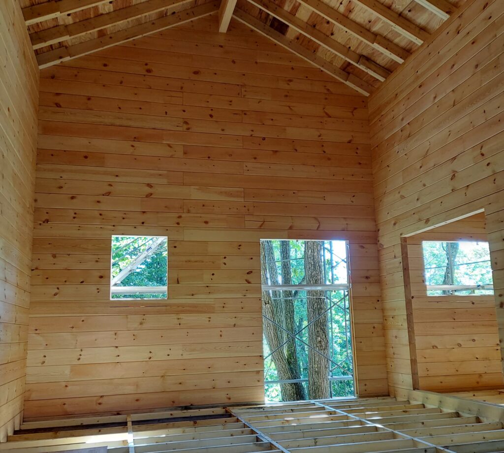 新築なので室内にはまだ木の香りが漂い自然木の温もりが感じられる大変きれいで気持ちの良い空間となっております。窓から周囲を見渡せばそこには自然林が広がり外に出れば森の中に佇む一軒家だと気づくでしょう。バルコニーの中に木が生えていたり少し変わったレイアウトのところもありますが、これはなるべく森を切り開かず木と家とを共存させたいとの思いが込められているからです。