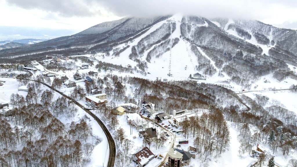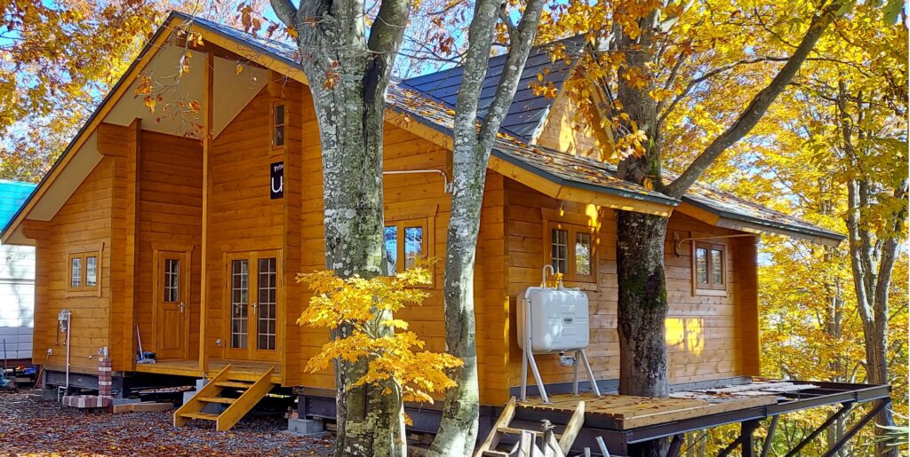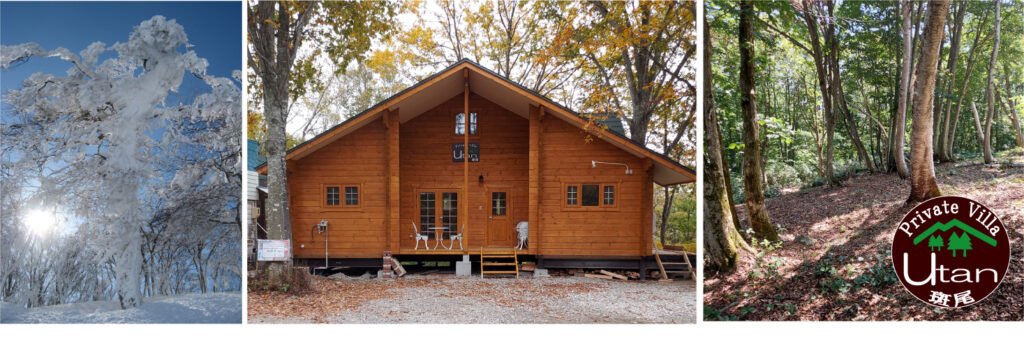 今夏より新築中の私たちのログハウスはどこに行くにも便利。斑尾高原スキー場の入口までは約150m(徒歩2分程)公共のバス停や駐車場、多くのレストランなどがある中心部へも徒歩圏内。