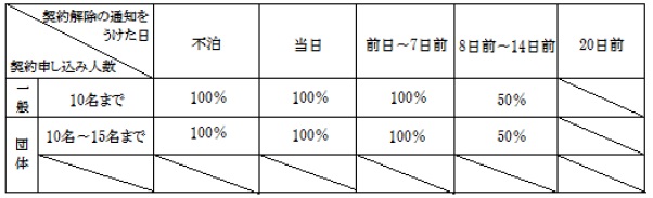 1. パーセント(%)は、予約宿泊料に対する違約金の比率です。